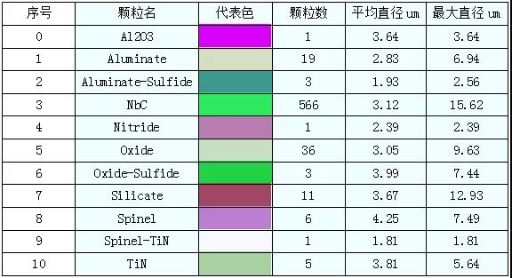 通过结果分析可以看出,采集夹杂物最小尺寸为1μm,在保证每个点至少有60000个计数的基础上,该区域共831个颗粒,扫描时间只需要25min,保证准确率的基础上效率非常高。通过OTS自带的标准库自动将夹杂物进行分类,结果显示大部分的析出相为NbC(N),平均尺寸大约为3微米,分布不是非常均匀,有的区域分布有一定的方向性,呈条状分布,因此为了提高强度和塑性,还需要进一步改善工艺,降低微米级NbC(N)的含量,同时使其更均匀的分布。